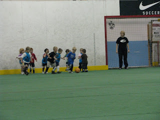 Ian is in week 3 of soccer class at Indoor Goals right near our house. He's a bit unsure of himself and carries the ball as much as he kicks it, but today he participated for the whole 45 minutes without a meltdown - major success! (didn't hurt that brother was there to watch AND mom had an orange tootsie pop for a reward!)